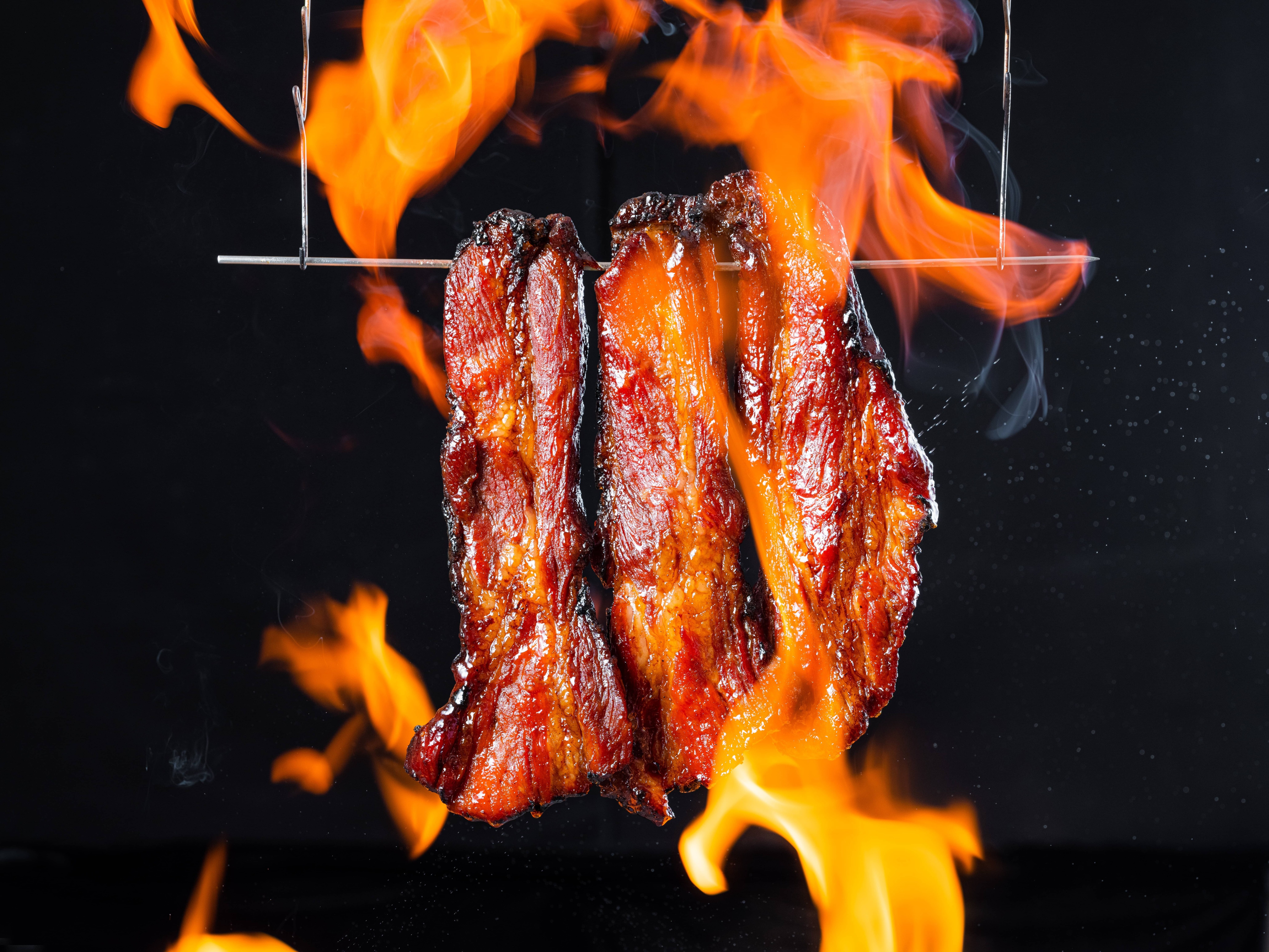 已有雏形的叉烧串于铁丝,撒盐、倒酒