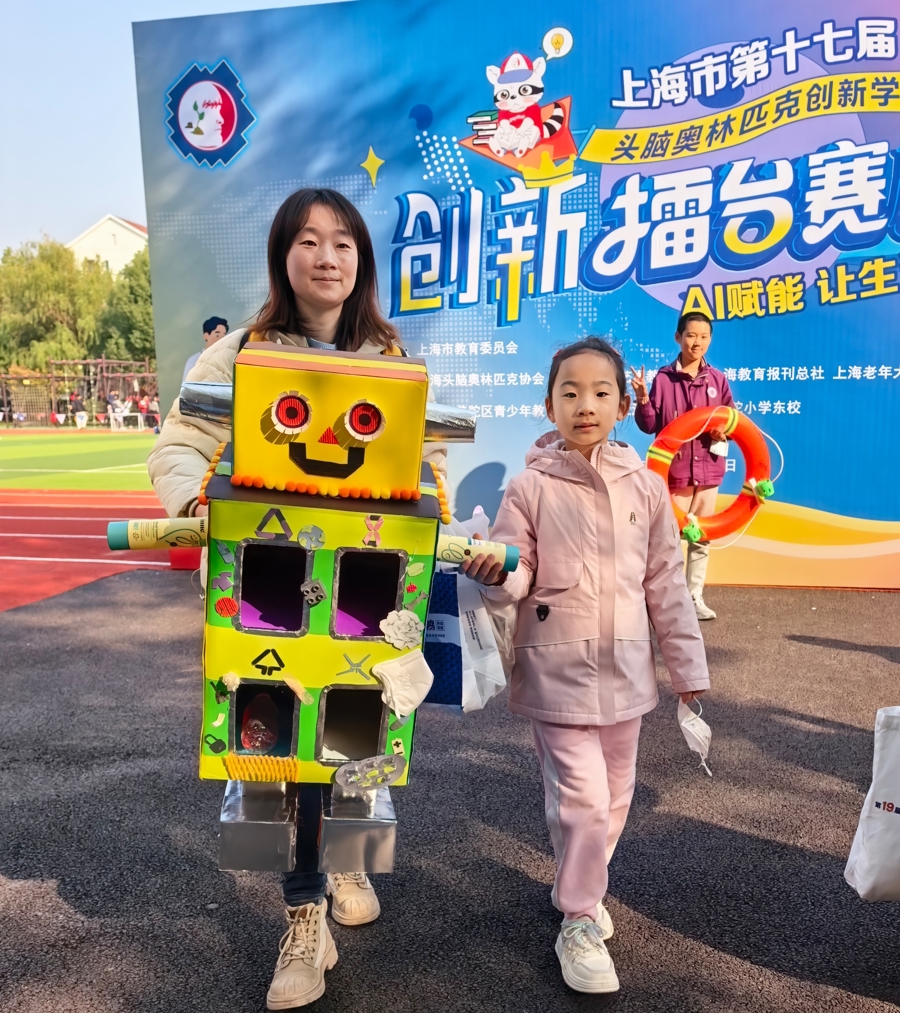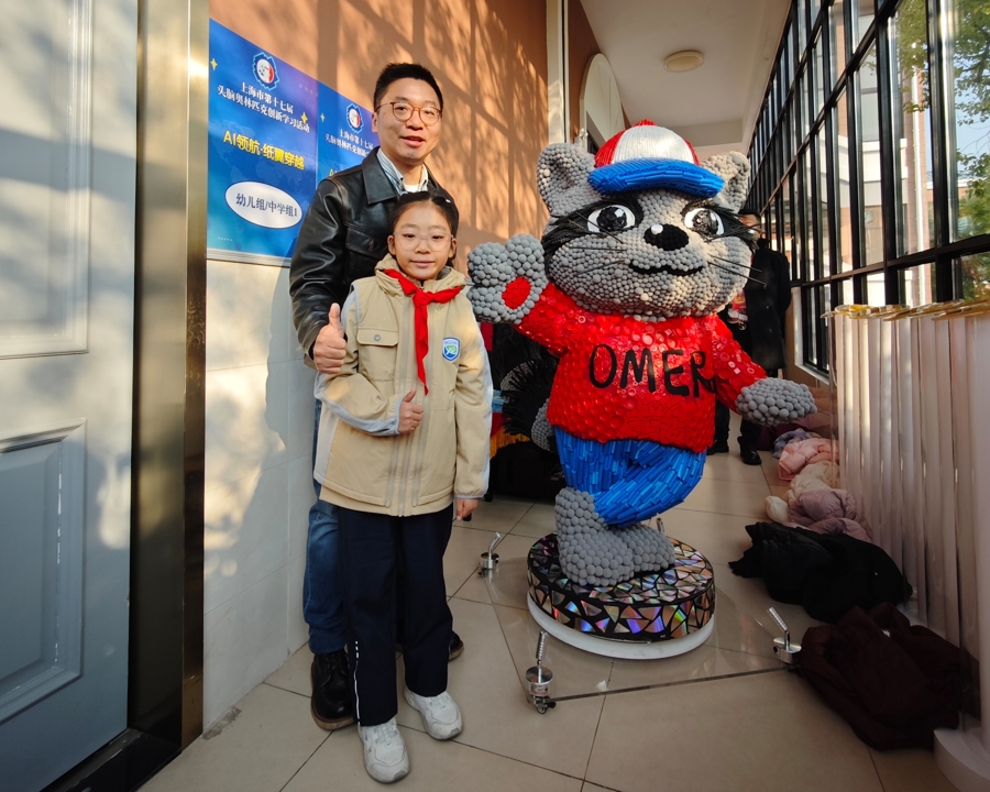 用废弃纸箱、泡沫等常见废旧材料,通过切割、拼贴塑造,斑斓的颜料为头脑奥林匹克活动吉祥物奥梅尔(OMER)雕塑赋予了鲜活色彩……这件由上海市普陀区新普陀小学东校学生顾伊昕家庭制作的创意装置,成为今天(11月22日)上海市第十七届头脑奥林匹克创新学习活动亲子创新擂台赛决赛开幕式的特别启动装置。日常生活中容易被忽略的材料,经过奇思妙想获得“新生”,不仅将环保理念融入趣味创造中,更鼓励青少年用发现的眼光和创新思维实践可持续发展理念。